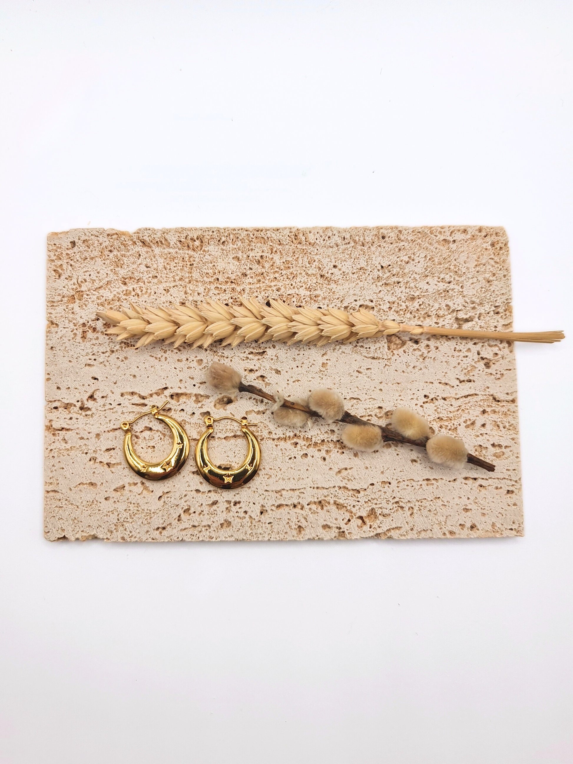 The Faye 18k Gold Plated Stainless Steel Star Etched Hoop Earrings.