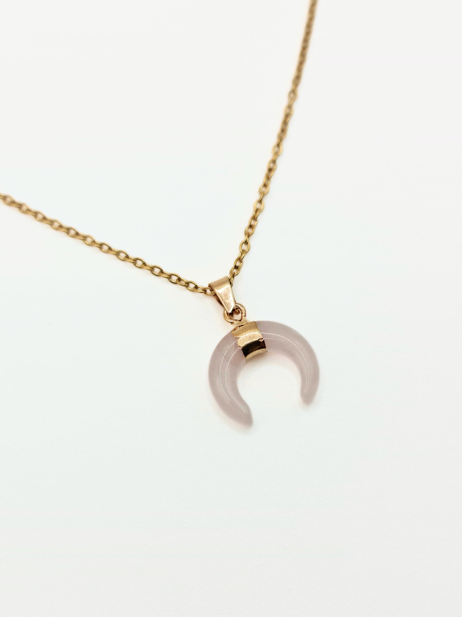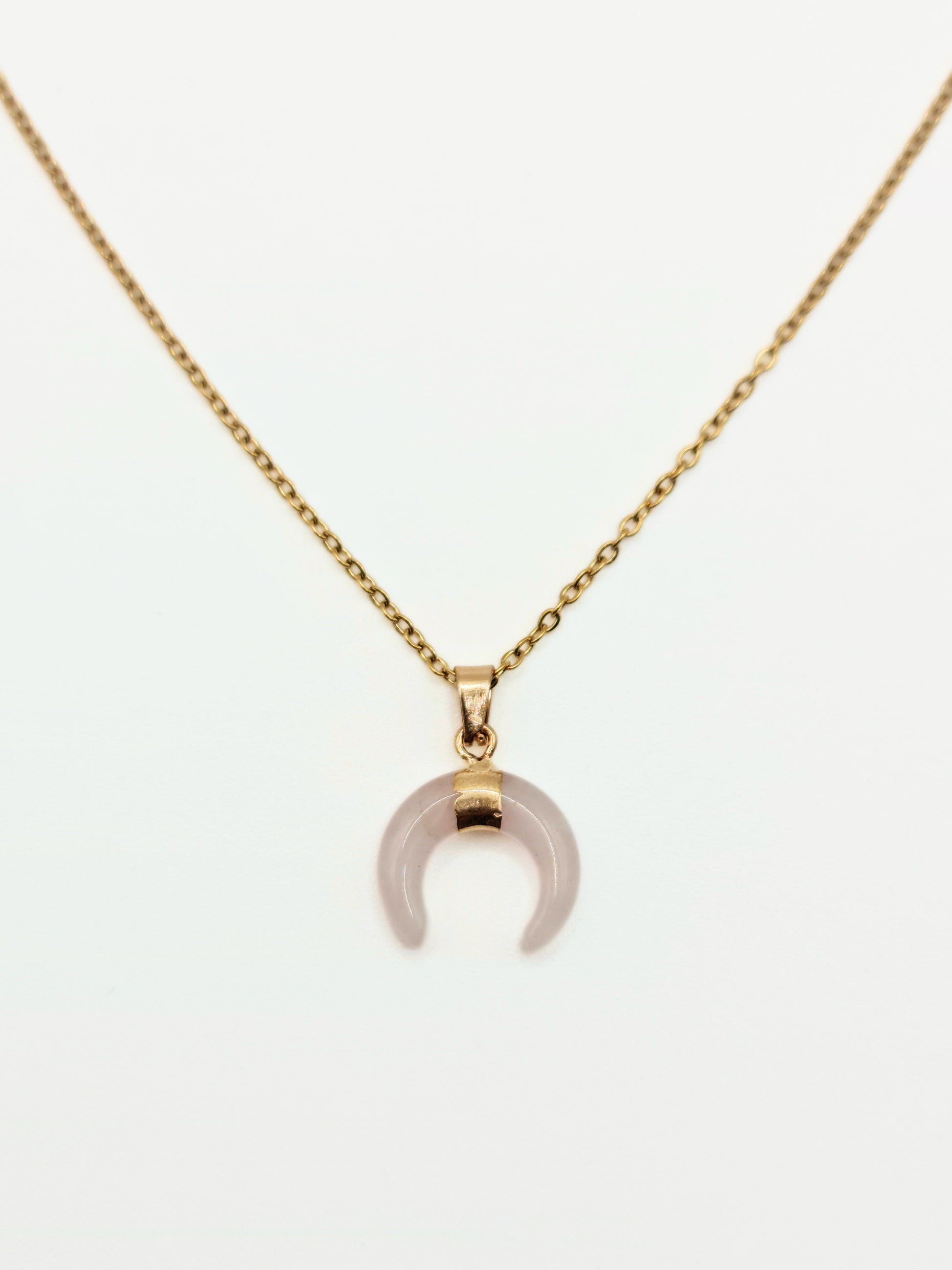 The Talisman Collection Rose Quartz Horn Moon Pendant Necklace exudes soft elegance and modern charm, featuring a semi-precious Rose Quartz gemstone set in 18k gold plating. Admired for its delicate blush tone and smooth finish, Rose Quartz is often associated with love, compassion and emotional healing.