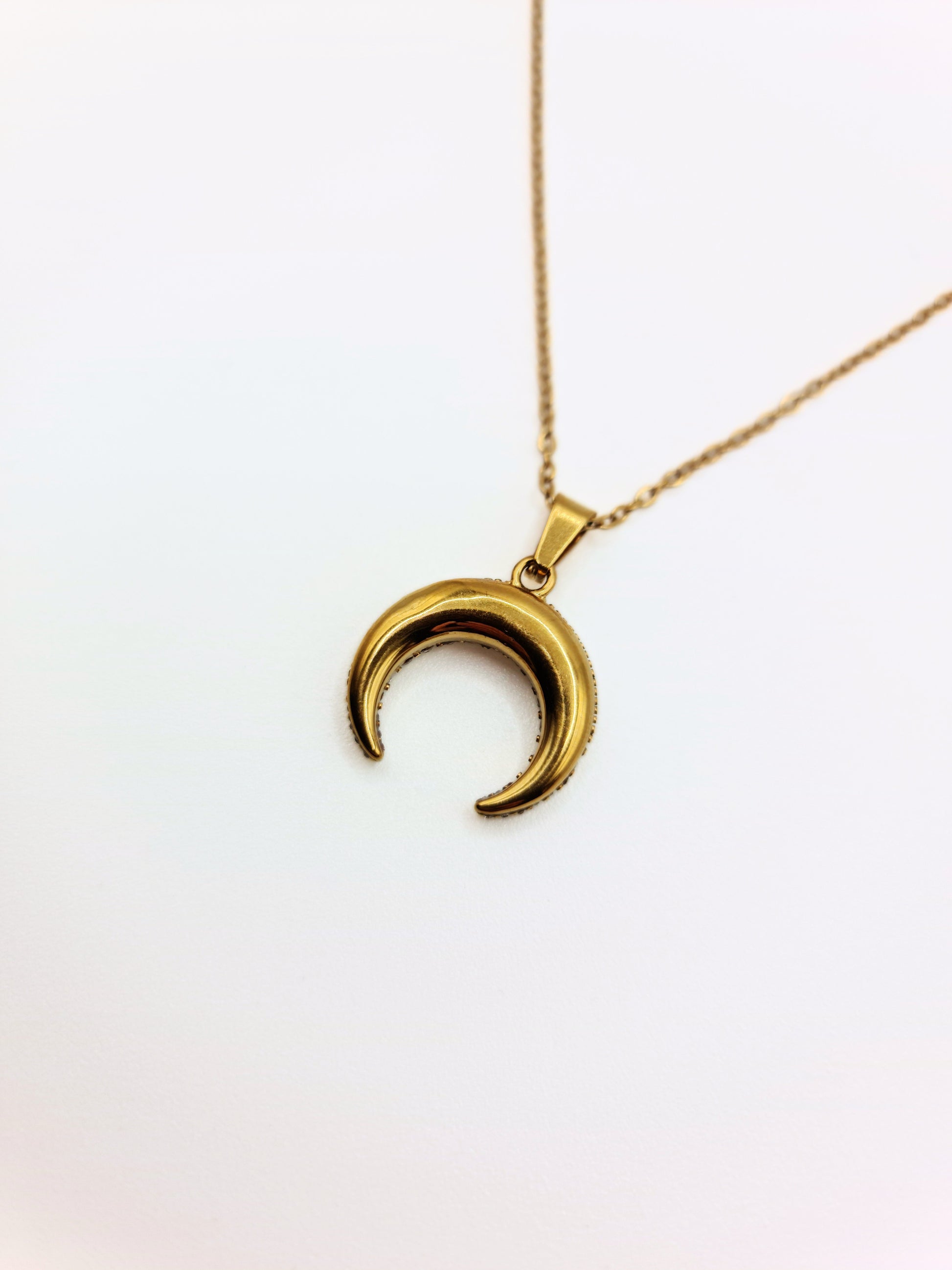 Add a touch of celestial sparkle with this 18k gold-plated horn and moon pendant featuring dazzling cubic zirconia crystals. Part of our Talisman Collection, this elegant necklace combines modern sophistication with symbolic charm — perfect for layering or wearing solo to bring light, positivity, and a subtle shimmer to your everyday style.