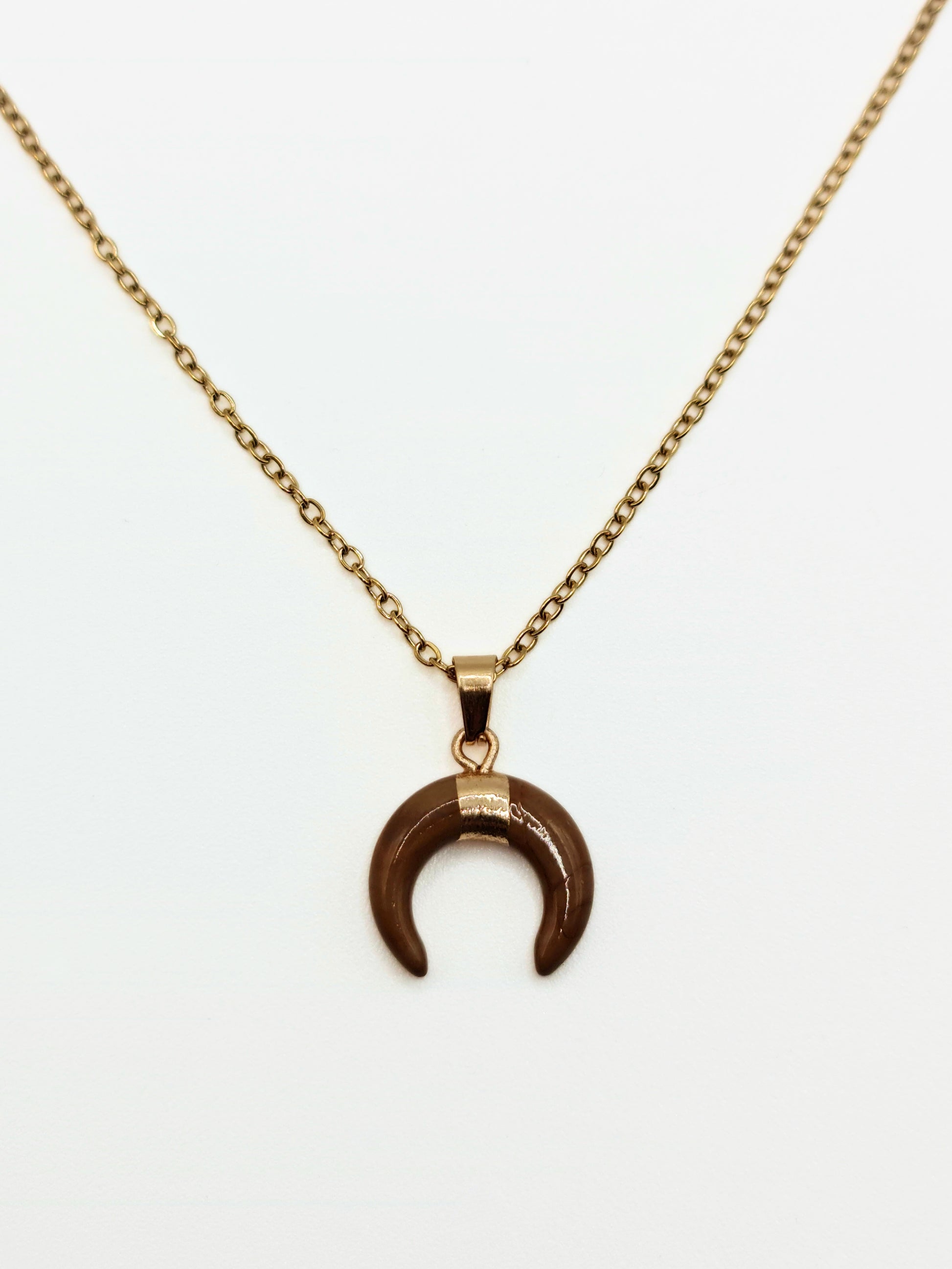 The Talisman Collection Brown Jasper Horn Moon Pendant Necklace embodies understated elegance and natural warmth, featuring a semi-precious Brown Jasper gemstone set in 18k gold plating. Known for its earthy hues and unique, organic patterns, Brown Jasper is often associated with it's protecting, grounding and rejuvenating properties.