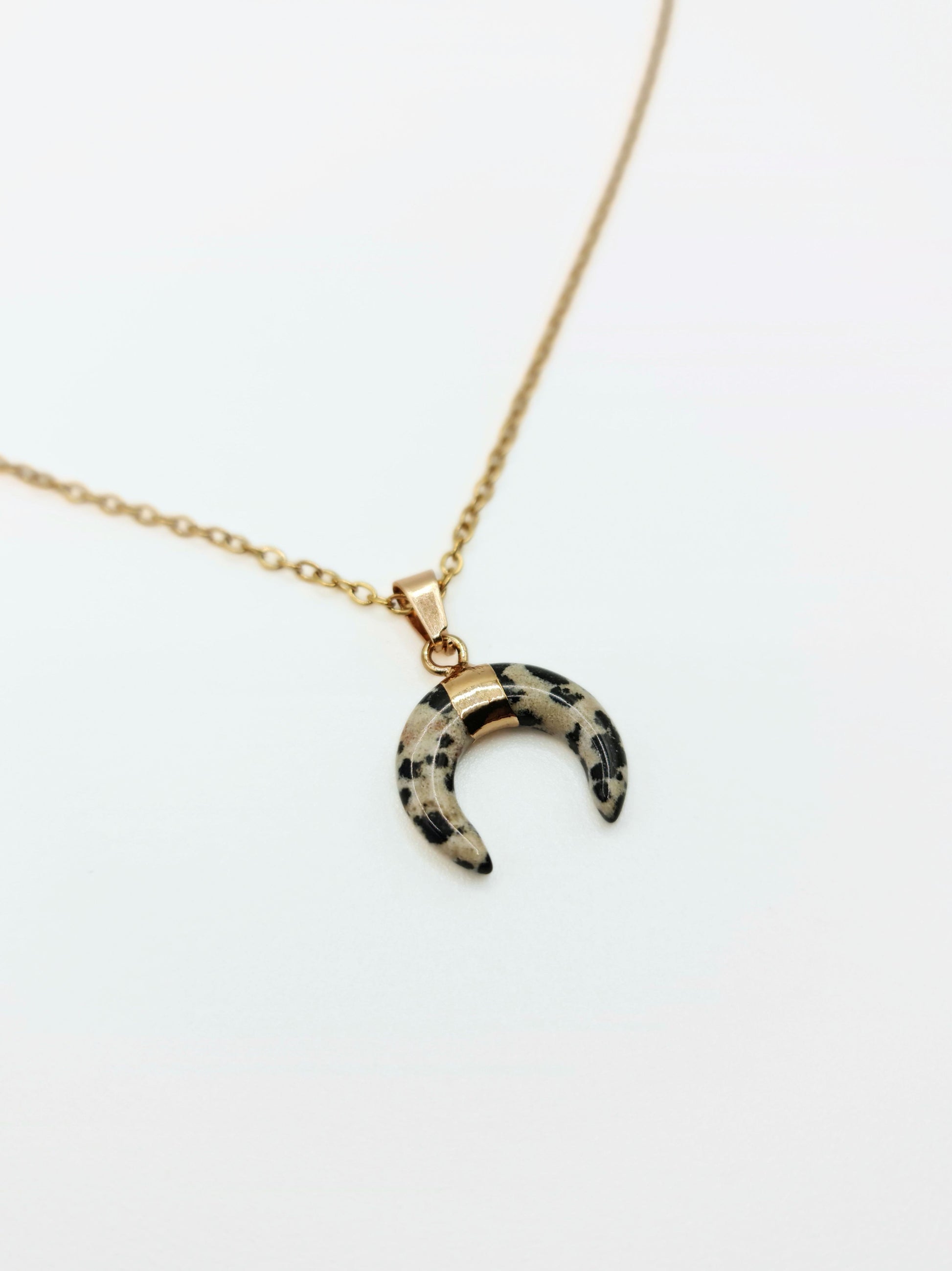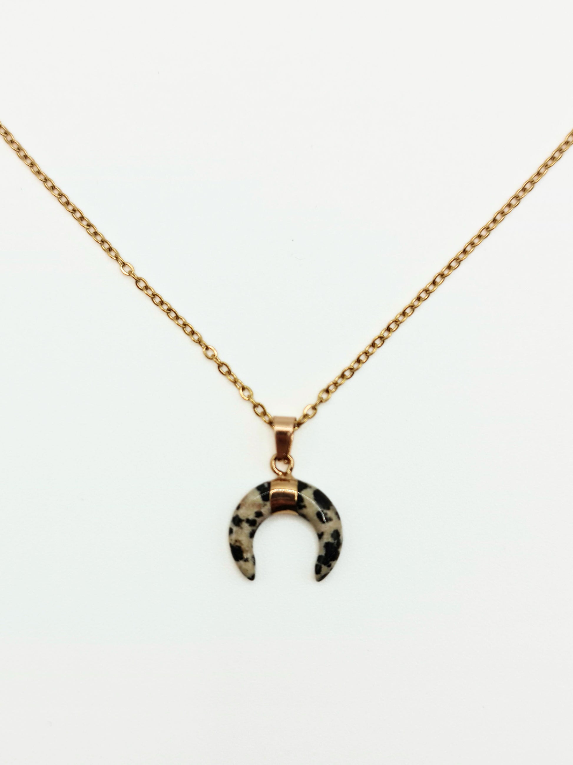 The Talisman Collection Dalmatian Jasper 18k Gold Plated Semi Precious Gemstone Horn Moon Pendant Necklace